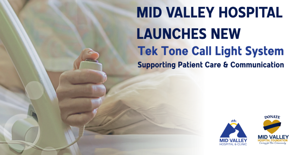 FOR IMMEDIATE RELEASE Mid Valley Hospital Launches New Tek Tone Call Light System to Support Patient Care and Communication Omak, WA — Mid Valley Hospital is pleased to announce that its new Tek Tone call light system is now fully operational and in use throughout the hospital. This important upgrade enhances communication, responsiveness, and support for patient care teams across the facility. The new system is designed to improve workflows and strengthen timely communication during both routine care and urgent situations. A key feature of the upgraded system is the integrated overhead paging function tied to Code Blue activation. When the Code Blue button is pressed, the system will automatically announce “Code Blue” and the location three times overhead, helping alert care teams quickly and clearly. Following the conclusion of a Code Blue event, staff should make an overhead page to announce that the code has ended and the situation is clear. Hospital leadership extends its appreciation to team members for their cooperation, patience, and support throughout the implementation and transition process. “We appreciate the collaboration of our staff as we continue investing in tools and systems that strengthen patient care, communication, and operational efficiency,” said Mid Valley Hospital leadership. Team members who have questions, experience issues, or need assistance while using the new system are encouraged to contact IT for support. This new call light system reflects Mid Valley Hospital’s continued commitment to improving the care environment for patients, staff, and the community. About Mid Valley Hospital & Clinic Mid Valley Hospital & Clinic is dedicated to providing compassionate, high-quality care with exceptional experience for those who need us. Serving Okanogan County and the surrounding region, the clinic offers trusted healthcare services focused on improving the health and wellbeing of the community. Media Contact: Mid Valley Hospital & Clinic Whitney Somday Director of Marketing & Foundation